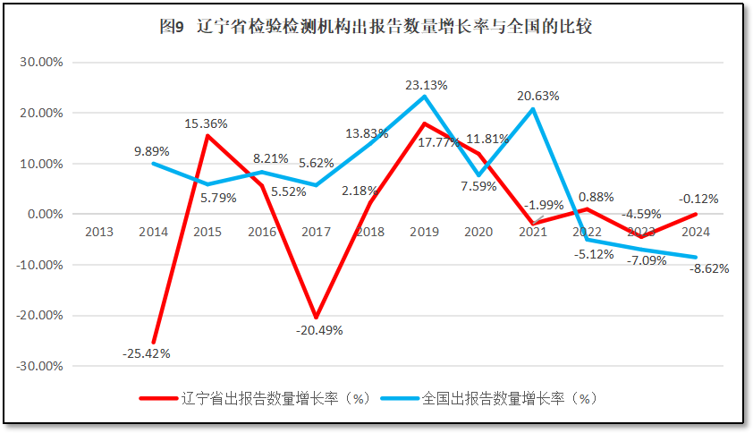 辽宁省检验检测机构出具报告数量的增长率与全国检验检测机构出具报告增长率的比较如图9所示。